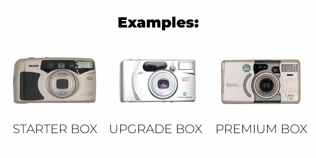 Minolta, Konica, Ricoh, Canon, Nikon, Rollei, Samsung, Pentax, Olympus, Yashica, Polaroid or many more ... The difference to the Upgrade Box is that those cameras are even more popular and have a better quality. For example a Olympus mju zoom, Canon Prima Super 130 or Konica Lexio. You will tend to get a camera that is worth 129€ to 189€ on the website with a film and battery included!